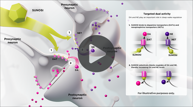 SUNOSI is thought to work by selectively inhibiting the reuptake of dopamine (DA) and norepinephrine (NE).1,2*
